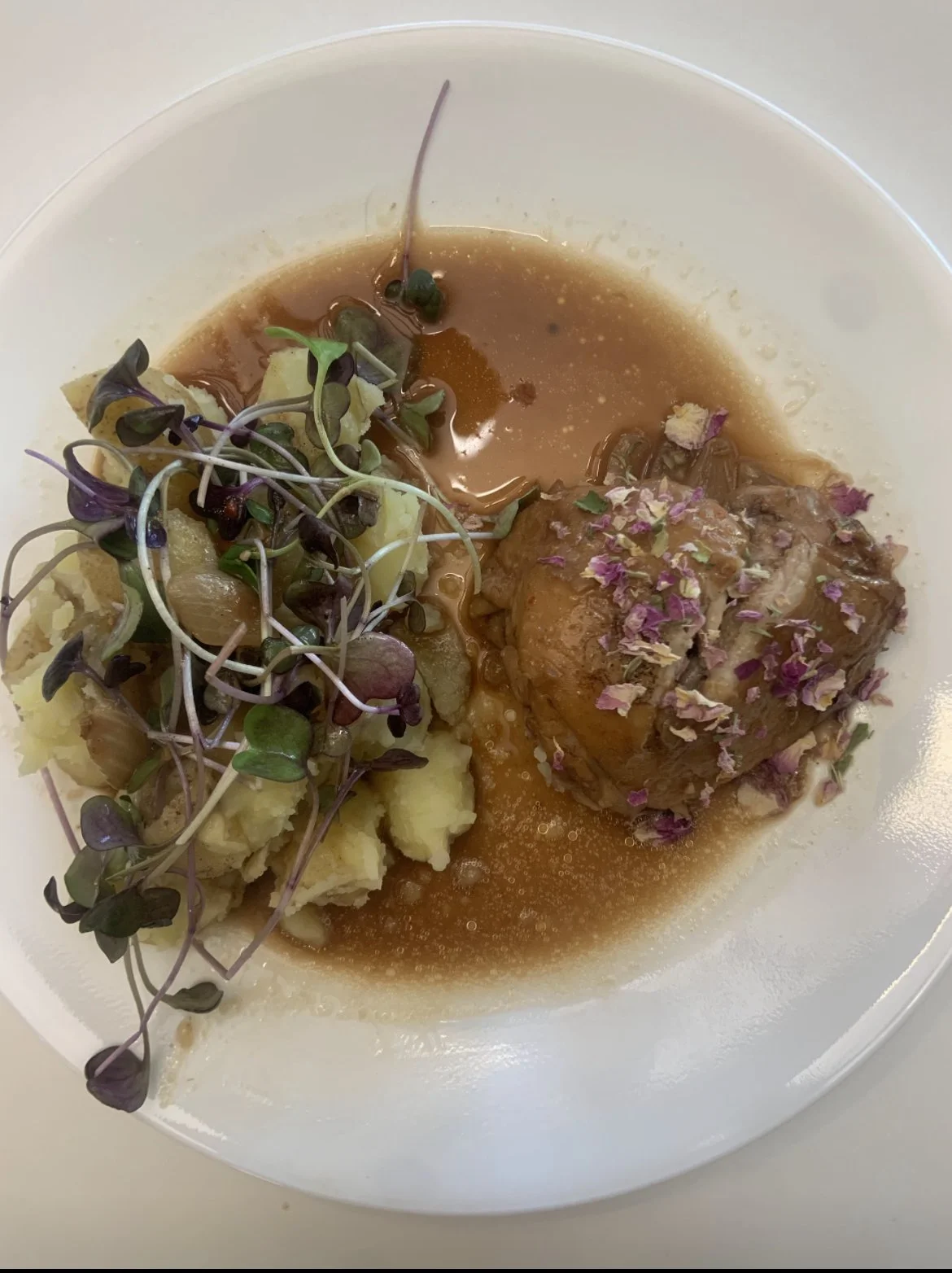 Chocolate Chicken is a savoury chicken dish made with collagen‑rich bone broth, unsweetened cacao powder, rose petals, and skin‑on chicken thighs. Cacao is used here as a bitter, mineral‑rich ingredient that adds depth to a glossy, broth‑based sauce.
